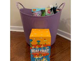 Everything needed for a day of summer fun at your house! Basket includes Hawaiian Ice Shaver with flavor bottles, Shaved Ice cups and straws, tie dye kit, Beat That! game, and bubbles.