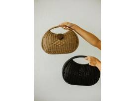 Top handle handbag with straw/wicker detailing. Snap closure. Fully lined with inside pocket. Available in black. Imported