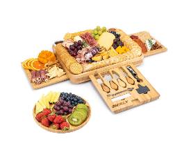 Learn how to make beautiful boards using this how to book and premium bamboo cheese board. This is a Smirly cheeseboard and knife set that is 16x13x2.