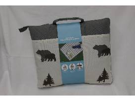 -The picnic blanket has an outdoor theme with bears and pine trees, folds into a compact tote, includes a shoulder strap for carrying and two large pockets for storage.