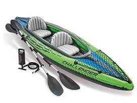 Enjoy your time on the water with this two-person kayak! Easy to transport for fun on the lake, river, or just about anywhere! The Intex Challenger K2 Kayak is sporty and fun with a streamlined design for easy paddling. The bright green color and sporty graphics make the kayak highly visible in the water. Two 86 inch aluminum paddles and an Intex high output pump for easy inflation and deflation. Made of company's rugged, super tough vinyl that's puncture and UV damage resistant for long term durability. Measures 30 by 15 by 138 inches (W x H x D) inflated, with 400 pound maximum weight limit; includes two 86 inch aluminum oars, high capacity pump, and repair patch kit.