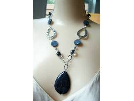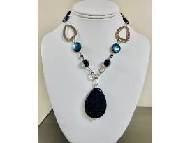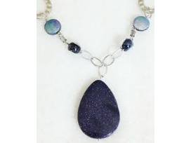 Genuine Goldstone and Mother-of-pearl silver chain necklace. The necklace is 16" with an adjustable 2.5" chain. The blue goldstone is 1 3/4" long and hangs from a silver chain.