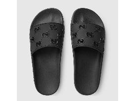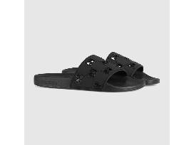 Classic styles are presented in rubber with a playful twist. Here, the rubber slide sandal is defined by a perforated monogram motif-an evolution of the original Gucci rhombi design from the 1930s.