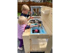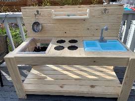 The best days end with mud on your clothes!!! Let them get dirty with this custom kids' mud kitchen, made locally! Can be customized for the height depending on kids; ages. Comes with hooks, removable shelf and 2 mixing tubs with lids, 2 metal pots and pans with mixing utensils, AND a kids play sink (with accessories) that with running water (reused over and over for hours of fun!) The sink can be swapped out with one of the tubs for versatile use. Optional painted burners (as pictured).