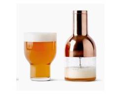 The Beer Foamer gets you as close to the Pub experience as you can without leaving your home. Denser beer foam will significantly increase the taste, aroma and feeling of the beer - just like beer fresh from the tap. Beer enthusiasts normally recommend pouring with a bit of a splash to create a head. This will create foam, but with large bubbles and low density. This sadly destroys the bubbles in the beer and leaves you with boring, flat beer and inferior foam. Not what you want at all. In frustration over this we invented a tool to separate the foaming process from the pouring process. And we achieved what we hoped for: Crisp, bubbly beer and soft, dense foam - just like draft. The foam is created in the clear shatterproof container. The copper top holds the foaming device itself and has its visual inspiration from the large copper boilers you see in old beer breweries. Pour ¼" - ½" of beer into the container. Gently pour the rest of the beer in your drinking glass - carefully to keep in the bubbles. Put the of the foamer top in place and press the button. The foam will rise in the foamer's glass beneath the copper top. Take the top off and gently pour the foam on top of your beer. Enjoy! Materials: Copper-plated Plastic, Battery Driven Motor, Stainless Steel. Dimensions: 3" x 6.9". Designer: Norm Architects Runs on 2 x AA battery.