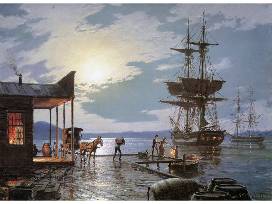 1In this 12" x 16" framed and signed print by Artist John Stobart entitled "Embarking on the Voyage Home San Francisco 1850," the brig, anchored in deep water, awaits its new passengers, who will be taken abroad from a small boat. The picture was intended to conjure feelings of a moment of truth in a lonely world, of hopes and expectations at the start of an adventure. Its features were a common sight in the late 1850s, when the mode of transportation was the lowly buggy, casks were the method of shipping everything from apples to nails to oil, and the wooden ship was the carrier for greater distances.