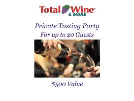Total Wine & More will host an event that is certain to impress you and your guests. Enjoy a tour of the land and learn about the famed appellations and grape varietals that make each region so unforgettable. Taste a variety of our premium, hand-selected wines and discover hidden treasures from the wine region of your choosing. One of our wine experts will present and discuss each delicious wine during your two hour class, which can be arranged as a seated class-style or more casual walk-around event. Total Wine & More will provide all necessary stemware and educational handouts for tasting notes. Value - $500