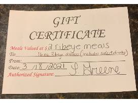 WOW! What a steak........and you get two of them!! Another delicious donation by Country Boys. This item is for two (2) 16 ounce Ribeye Dinners (includes sides and drink) donated by Country Boys.