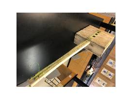 A handmade, standing wooden bass guitar with nylon strings, "Hillbilly Bass Guitar" made by Environmental Science student, James Amos
