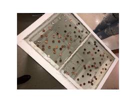A white chest with a 110 year old window procured with old pennies epoxied to the glass as a lid. It would be a beautiful blanket chest for anyone who loves old farmhouse things. made by Environmental Science student, Makayla Oliver.