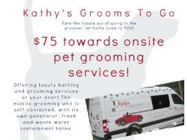 Avoid the stress and inconvenience of taking your pets to a groomer. Kathy's Grooms to Go will come to you! Dedicated to the excellent care and grooming of your furkid without the trouble and trauma of traditional grooming. Grooming onsite in their fully equipped van!