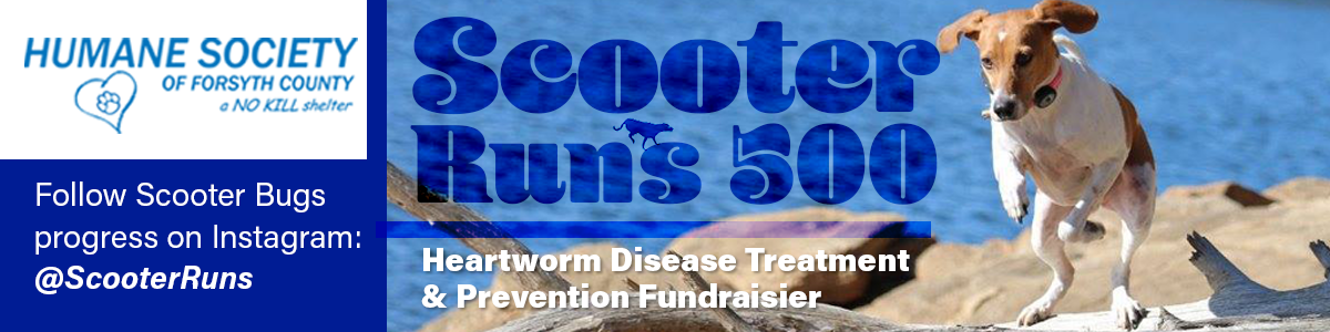 Former Humane Society of Forsyth County (HSFC) rescue dog, Scooter Bug, is running 500 miles in 2021 in an effort to raise funds and awareness to help treat and prevent heartworm disease. You can help by donating, becoming a fundraising champion below, and spreading the word.