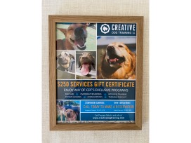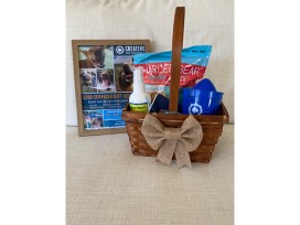 Basket of dog related goodies and a $250 gift certificate for services at Creative Dog Training