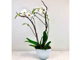 Blooming phalaenopsis orchids arranged with moss and willow branches in a designer container from Dorothy McDaniel's Flower Market