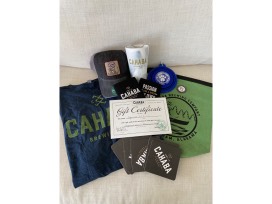 Gift certificate for private tour and tasting for 4 people, silipint cup, collapsable dog bowl, $5 chip, hat, t shirt (XL), dry bag, stickers and coasters.