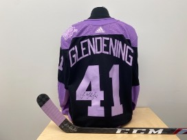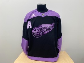 Bid now on this authentic black and lavender warm-up jersey (Size 56) and lavender-taped hockey stick used and signed by Luke Glendening during the 2020-21 Red Wings' Hockey Fights Cancer Night. Package includes a certificate of authenticity.