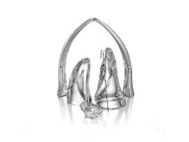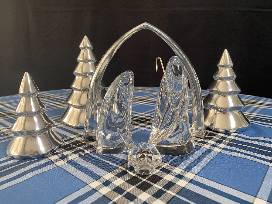 Celebrate the Christmas season with the Glass Holy Family w/ Creche. This 4-piece glass nativity scene depicts Mary, Joseph and Baby Jesus as beautiful glass figurines and a lustrous Nambé creche, keeping the true meaning of the holiday at the forefront of your festive decor. With this gorgeous Nativity Set comes a set of three Mini Christmas Trees that feature carefully sculpted boughs that give the effect of freshly fallen snow. What a gorgeous addition that could be a part of your holiday décor!