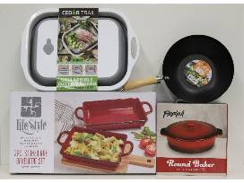 This package includes a collapsable cutting board, wok pan, 2 piece bakeware set and round bakeware dish