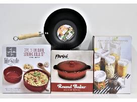 This package includes an air tight food storage set, 2 pc stoneware serving bowl set, round ceramic baker and 10" wok pan.