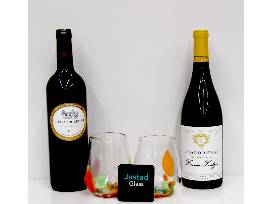 This package includes unique handblown stemless wine glasses and 2 bottles of wine. The wines are a Chateau Du Retout Bordeaux and a Domaine Loubejac Chardonnay
