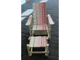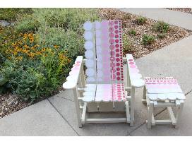 Custom made adirondack chair and stool/table. Designed to be easier to get in and out of then a basic adirondack chair. This piece took between 12-18 hours to complete. Made for outdoor use but should be protected in the winter if left outside, to enhance the lifespan of the chair.
