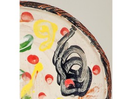 Thrown earthenware, slip, underglaze, clear glaze, fired to c.2, 2x13.5"