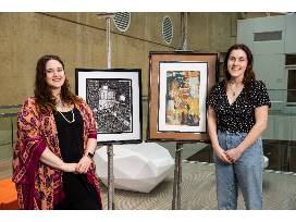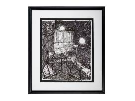Haley describes this piece, called Austice, as "kind of a lonely place" and the host committee loved how its black-and-white coloring matched this year's ArtsGala theme. "It's a night-time scene on campus, showing the Dunbar Library with its glowing interior lights spilling onto the parking lot," she said. "The fall weather combined with the dark, vacant scene feels bleak and cold, but the world inside the library looks warm and alive. I felt like the library was representational of learning and the business of academia. The brightness of the lights alludes to the brightness of scholars still awake and working to build their brighter futures."