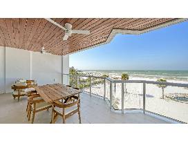 BREATHTAKING COASTAL LUXURY WITH DIRECT BEACH AND GULF VIEWS. This beautifully appointed three-bedroom, three-bath residence is the ideal place to take in the beauty of Siesta Key's sand, sea and sky. Located directly on the west side of the building, this stunning residence features expansive windows opening onto an oversized, beachfront terrace. The open floor plan perfectly complements the unmatched views, designed with coastal elements to match the stunning panorama. A chef's kitchen with top-of-the-line appliances and quartz-topped island are the perfect place to entertain with family and friends. The residence features a spacious master suite that opens onto the terrace, with walk-in closet and large master bath as well as two additional bedrooms with ensuite baths. A half-bath and fully equipped laundry room round out the floor plan. The property features an on-site concierge, linen service, beach valet with chair and umbrella service, beachfront water sports, under-building parking, EV charging stations, fitness room, Gulf-front fire pit, heated pool and spa, beachfront grills, poolside cabanas, and spacious entertainment terrace overlooking the pool deck and beach. Offering the perfect combination of luxury and family-oriented functionality, this residence is the ideal place to recharge and unwind in a truly incomparable setting.