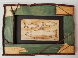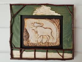 These two framed fire pottery relief wall hangings can bring an Adirondack flare to any room. Created by artist Art Baird. Each pottery piece is frames with birch bark and twigs, surrounded with a green accent color to draw attention to a majestic moose and the beautifully formed school of fish.