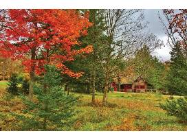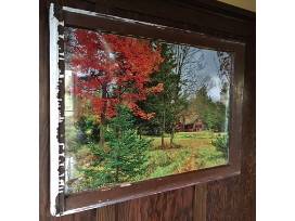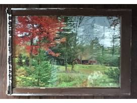 This framed photo was taken by Trustee Martin Daley. It is a look across camp from the Collins Building to Alfred's Cabin during the fall. The frame is a salvaged window frame.