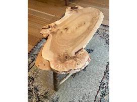 This hand crafted table is made from yellow birch, with a natural edge, mapped burls and birch legs with materials sourced locally in Indian Lake.