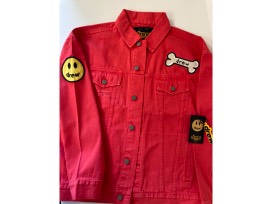 From Justin Bieber's wildly popular "Drew House" clothing line, the Buddy Trucker Jacket in Washed Red, features the signature "Drew" name and face, with dog bone name patch and adorable dog applique on back. This sold out online in seconds! Size Small but runs very large.