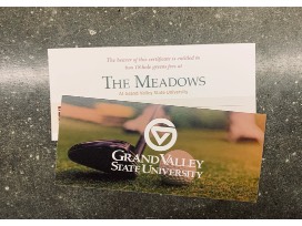 1The is the ultimate gift for the golf lover in your life! This package include a round of golf and an exclusive Scotty Cameron putter cover. Want to be the talk of the course? Do you want to never three putt again? Bring home this charcoal grey, black and blue Scotty Cameron Custom Shop Jackpot Johnny blade style putter cover. Ready to show off that putter cover? Tee off at The Meadows Golf Course at Grand Valley State University! Home of 9-time national champions, this course boasts a four and a half star facility and is a challenge for any golfer. The package includes two certificates for 18 holes, each entitling two players to golf. Must purchase cart.