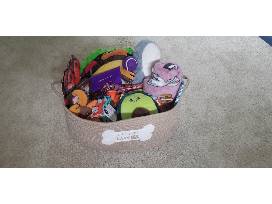 Spoil your dog with a basket filled to the rim with everything fido could want! This woof worthy gift basket has hours worth of entertainment with more than 10 unique toys. Also included is a soft plush blanket, poop bags, multiple bags of treats, and pet wipes!