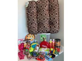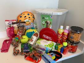 Your dog will love lounging on this 28" square super comfy dog bed (bonus: it's machine washable!) along with all sorts of treats, toys, bath products, and don't forget the waste bags all included in a very handy food bin.