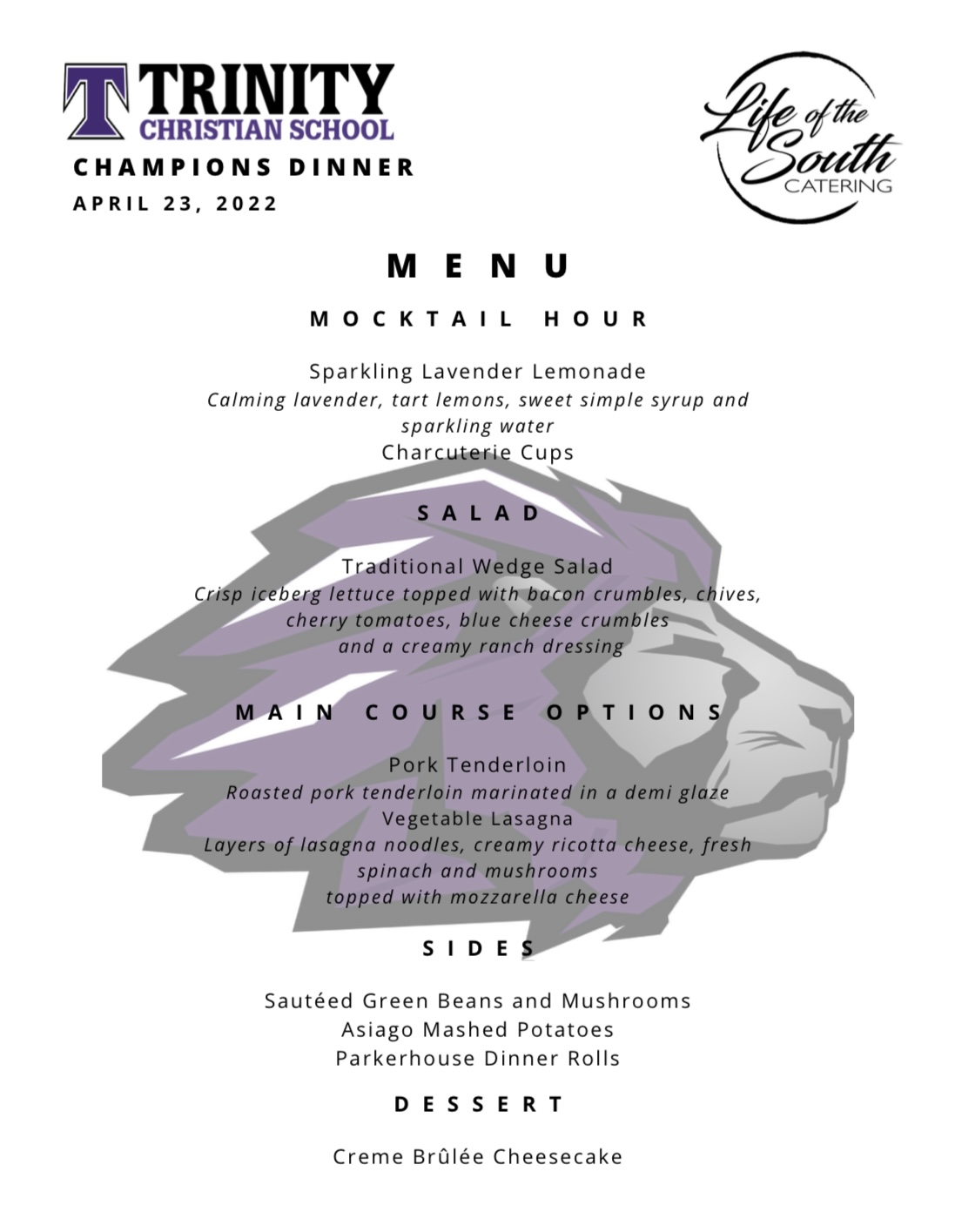 Thank you for supporting our 2nd Annual Champions Dinner benefiting your Lions Club who purchases items for all 21 sports at TCS! Our event was a huge success. Thank you to all of you who made a donation, purchased a table/ticket, or donated an auction item. Thank you to all of our student athletes who helped set up, serve dinner, and clean up afterwards. Thank you to our coaches and athletes who made all of our videos and event so wonderful by agreeing to speak on video or on stage.