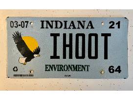 Expired specialty vintage license plate. Indiana, environmental license plate. Customized IHOOT. Not legal for vehicle use, decoration only.