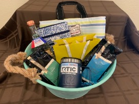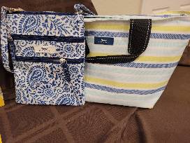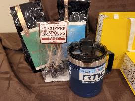 Scout Insulated Lunch Tote, Scout Cross Body Bag, Kendra Scott Ellms Stud Earrings, La Tazza Perfetta Hazelnut Coffee, La Tazza Perfetta French Vanilla Coffee, Hazelnut Coffee Spoons, RTIC 12 oz Coffee Cup, and Tito's Vodka.