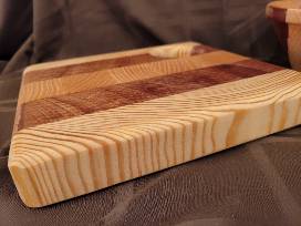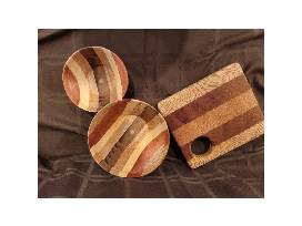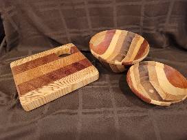 Two Handmade Wooden Bowls (Maple, Walnut, Mahogany and Lacewood, and Cutting Board.