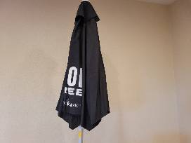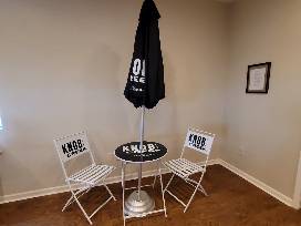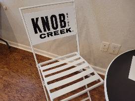 Knob Creek Bistro Set: Two Metal Chairs, Metal Table with Umbrella and a bottle of Knob Creek Straight Bourbon Whiskey.