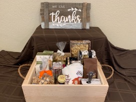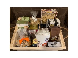 Foodies Delight Basket: Festa Italiana Marinara and Pasta, Tagliatelle and Green Pesto with Black Truffle Pasta, Imperial Matcha Green Tea, Earl Grey Tea, Twinings Jasmine Tea, Twinings Gunpowder Green Tea, Partridges Earl Grey Tea Biscuits, Partridges All Butter Biscuits, Chocolate Marshmallow Swirl Mix, The Hampton Popcorn Company Birthday Cake Crunch Popcorn, The Hampton Popcorn Company White and Dark Chardonnay Swirl Popcorn, Harry and David Maple Vanilla Coffee, La Tazza Perfetta Butter Rum Coffee, Bon Vivant Flavoring Spoons in Bourbon Honey and Dulce De Leche (2), Cookie Skillet, Two "Be Thankful" Tea Towels, and "We Give Thanks" Wood Sign.