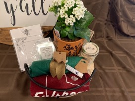 The Home Artistry "Hey Y'all" Round Wood Sign, Y'alls Candles Baja Cactus Blossom, Kalanchoe Potted Plant, Dash Blossoms "Fulshear, TX" Shirt (Women's Medium), "Grow" Shirt (Women's Medium), Dash Blossoms "Bee Kind" Notepad, "To-Do" Notepad, Bee Notepad, and Chestnut Ridge Designs Leather Earrings, Leaf Bangle, and Peppermint Lip Balm, and Tired Mama Treasures Sugar Scrub Cubes.