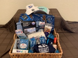 Run For the Roses Basket: Corkcicle Tumbler, Woven Throw Blanket, 2 Kentucky Derby Hats, Ladies Under Armour Half Zip (Large), Men's Half Zip (Large), Slim and Regular Can Cooler, Kentucky Derby Bag, 2 Official Mint Julep Glasses, Tervis Kentucky Derby 16 oz Mug, Two Tea Towel and Hotsox Men's Kentucky Horse Racing Socks