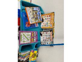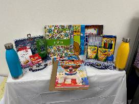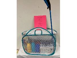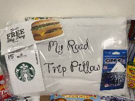 -Basket including Road Trip Pillow, Mom and Dad Travel Mugs, 2 water bottles, lap trap, travel games, back seat trash cans, activity books, crayons, colored pencils, back seat reacher, travel first aid/necessity kit, snacks