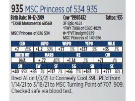 Bred AI on 1/3/21 to Connealy Cool 39L. PE'd from 1/14/21 to 3/18/21 to MSC Turning Point of 707 909.