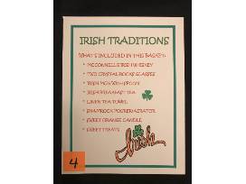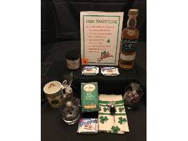 McConnell's Irish whiskey, 2 crystal rocks glasses along with Irish breakfast tea, mug with spoon, linen tea towel, shamrock pourer aerator, sweet orange candle & sweet treats