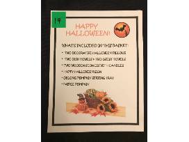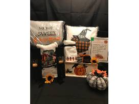 Decorative Halloween pillows, 2 dish towels, 2 guest towels, 2 wooden sconces and candles, oblong pumpkin serving tray, fabric decorative pumpkin and Happy Halloween sign