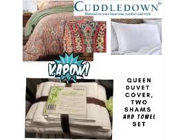 One Cuddledown 100% Percale cotton button closure Queen Duvet Cover. Made in Portugal Machine Wash warm normal cycle. Do not Dry Clean. Superior Sleep Starts with superior bedding. Cuddledown travels the world to bring unsurpassed quality and comfort that make their fine linens genuinely special. You will love the experience of incredible sleep and lasting luxury with this cuddledown cover.