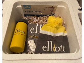 Elliott Physical Therapy 25-quart Bison Brand cooler filled with a water bottle, hat and shirt.
