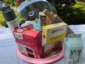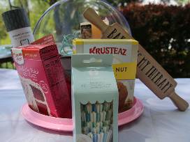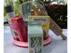 Who couldn't use some more sweet stuff in their life? This includes a cake plate with cover, mixing bowl with spatula & whisk, apron, cupcake cups, hot pad/mitts, nested measuring spoons/cups, vanilla swirl candle, Baking Therapy sign, 1 cake mix, 1 muffin mix, and sprinkles!